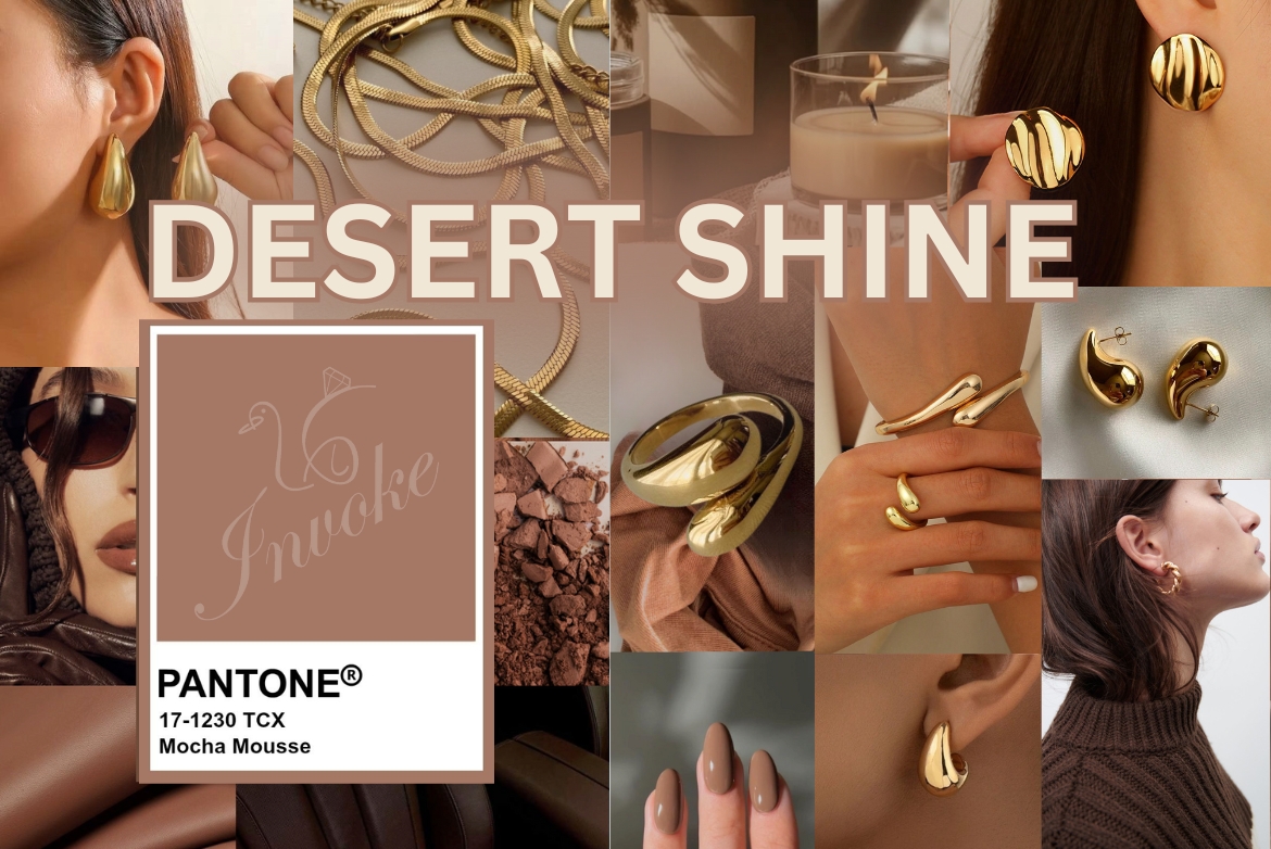 Да се облечете в мока мус означава да сте по-актуални от всякога. Цветът е интердисциплинарен, обхваща много индустрии - мода, обзавеждане, храни и напитки, откъдето идва и идеята за него. Чрез асоциацията с любимите на всички шоколад и кафе (доказано е, че цветът на храните и напитките силно въздейства върху възприятието на вкуса им) кафявото излиза от рамката на скромен и неутрален. Този апетитен нюанс изкушава на много нива. Той е въплъщение на съвременните ценности в бизнеса и в потреблението, на стремежа към устойчивост, прозрачност на производствените процеси и използване на натурални ресурси, а естетически всичко това се изразява чрез природни, земни цветове като кафяво. Завръщането към природата се превърна в лайфстайл на модерния човек, изразявайки се дори във външния вид. Мока мус е идеален за акцент на материи с изразена текстура като кадифе, велур, вълнени плетки, сатен. Но ние от Invoke знаем, че никой тоалет не е завършен без бижу. Затова имаме нещо подходящо за топлата, обгръщаща с уют визия на есента. Колекцията ни Desert Shine ще придаде към приглушения кафяв нюанс огнена искра, едно внезапно възпламеняване, напомнящо, че дори когато примира в своя зимен сън, животът отново ще избуи с все сила.